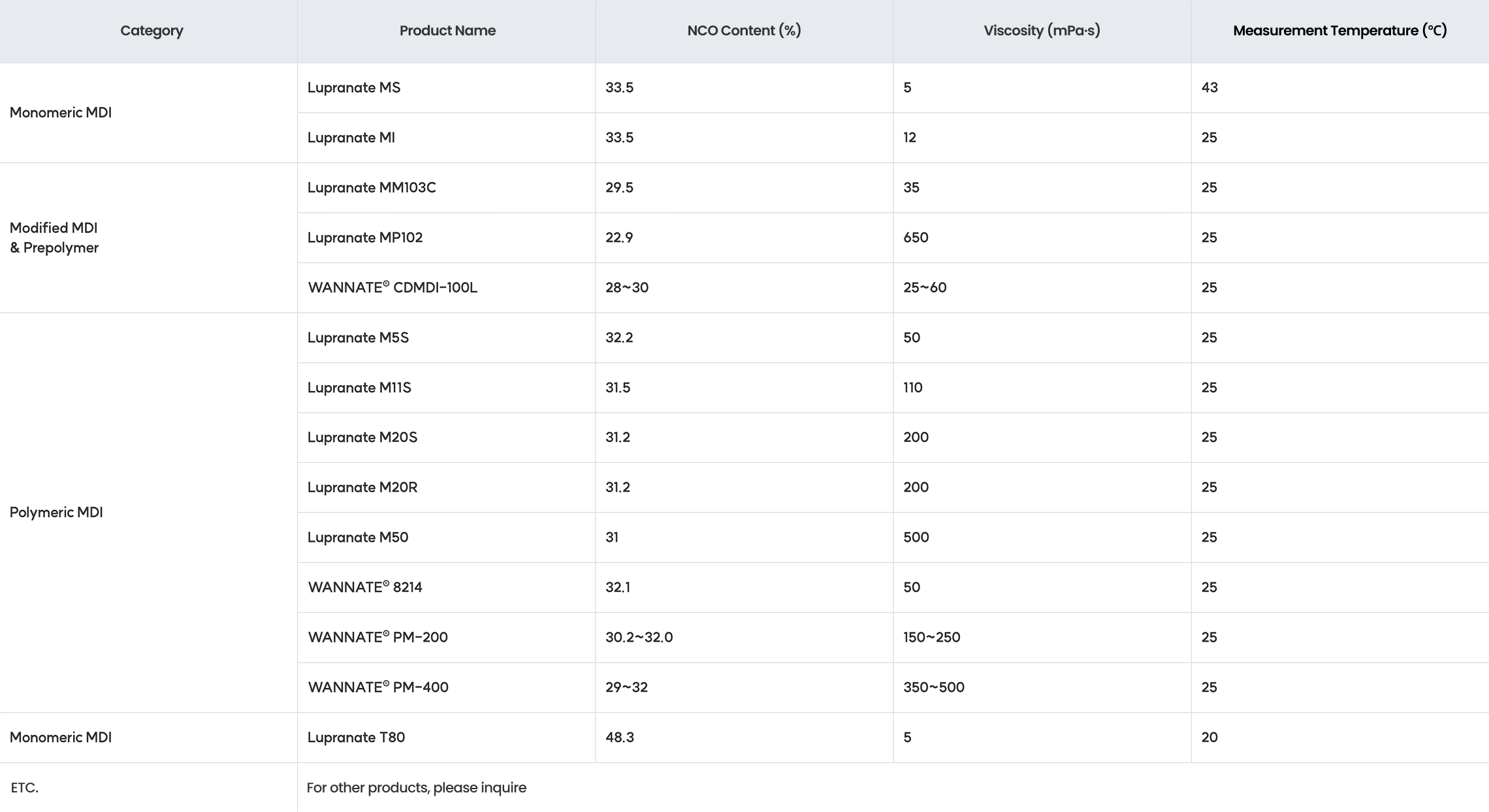 Information on major isocyanate raw materials used in polyurethane systems, including key properties such as content, viscosity, and handling conditions.